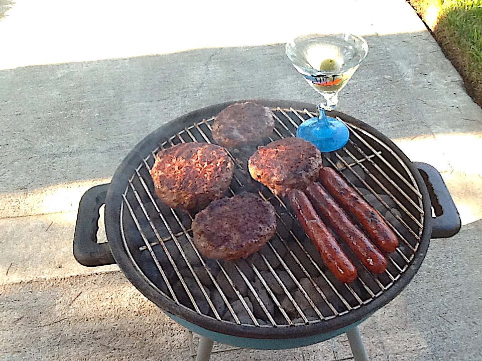 LOL to that martini on the grill – the answer to why it’s there is so obvious: close at hand and easy to reach between flips of various proteins! Dodging the occasional fire flareup counts as exercise, as do the flips, ya know?